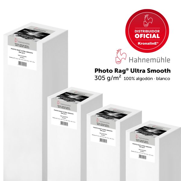 Photo Rag® Ultra Smooth de Hahnemühle suma un miembro más a la familia Photo Rag®, caracterizado por ser un papel aterciopeladamente suave y de especial lisura pensado para impresiones de gran calidad inkjet para bellas artes. El papel artístico de algodón blanco cuenta con una superficie muy finamente texturizada y discreta, convence por su sensación al tacto de especial suavidad. El recubrimiento premium mate inkjet garantiza resultados de impresión extraordinarios con una impactante reproducción de colores y detalles, y un negro de gran profundidad. Photo Rag® Ultra Smooth puede usarse en multitud de aplicaciones y demuestra su excelencia tanto para la fotografía de bellas artes como para otras reproducciones artísticas. Este producto todoterreno no contiene ácidos ni lignina, cumple con los requisitos más rigurosos de resistencia al envejecimiento y es especialmente idóneo para impresiones de bellas artes en blanco y negro de gran calidad.